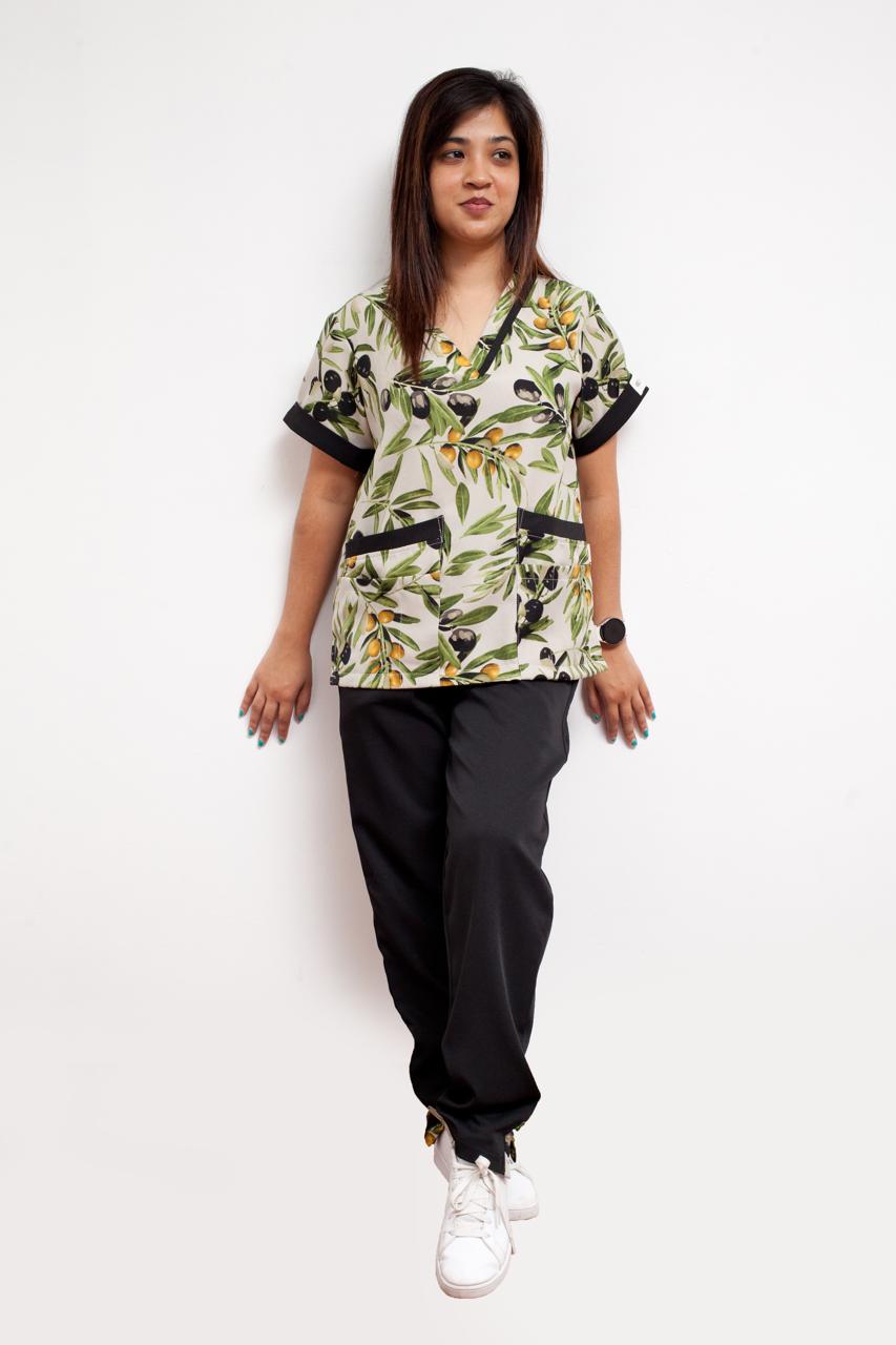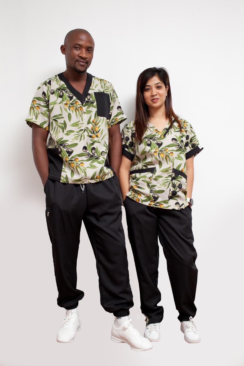 Crafted in soft, breathable fabric with a print featuring delicate olive branches, this scrub set blends comfort, culture, and purpose. The V-neck top includes functional pockets, while the jogger-style pants offer a flattering straight fit with drawstring detail, olive branch slit and secure zip pockets—designed for professionals who care deeply, not just about what they do, but what they stand for.