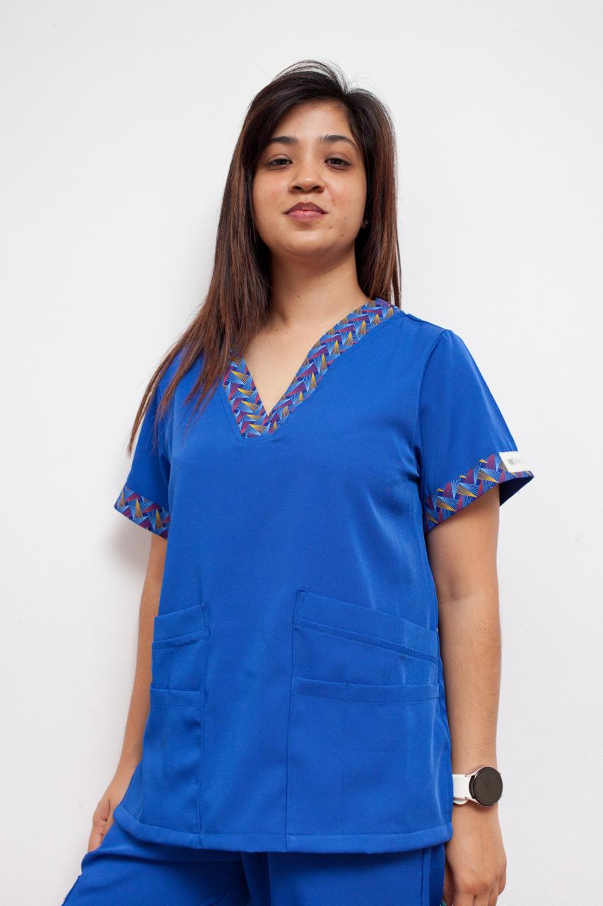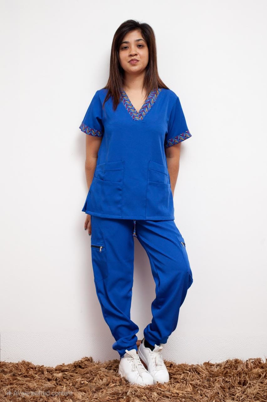 Step into style and comfort with our Royal Blue Ladies Scrub Set featuring bold Shwe Shwe trim. This matching scrub top and jogger pants combo is made from premium four-way stretch fabric that’s breathable, durable, and perfect for long shifts. The V-neck scrub top includes practical front pockets and culturally inspired 3 cats Shwe Shwe detailing on the neckline and sleeves, while the jogger-style pants feature zip pockets for secure storage and an athletic fit.